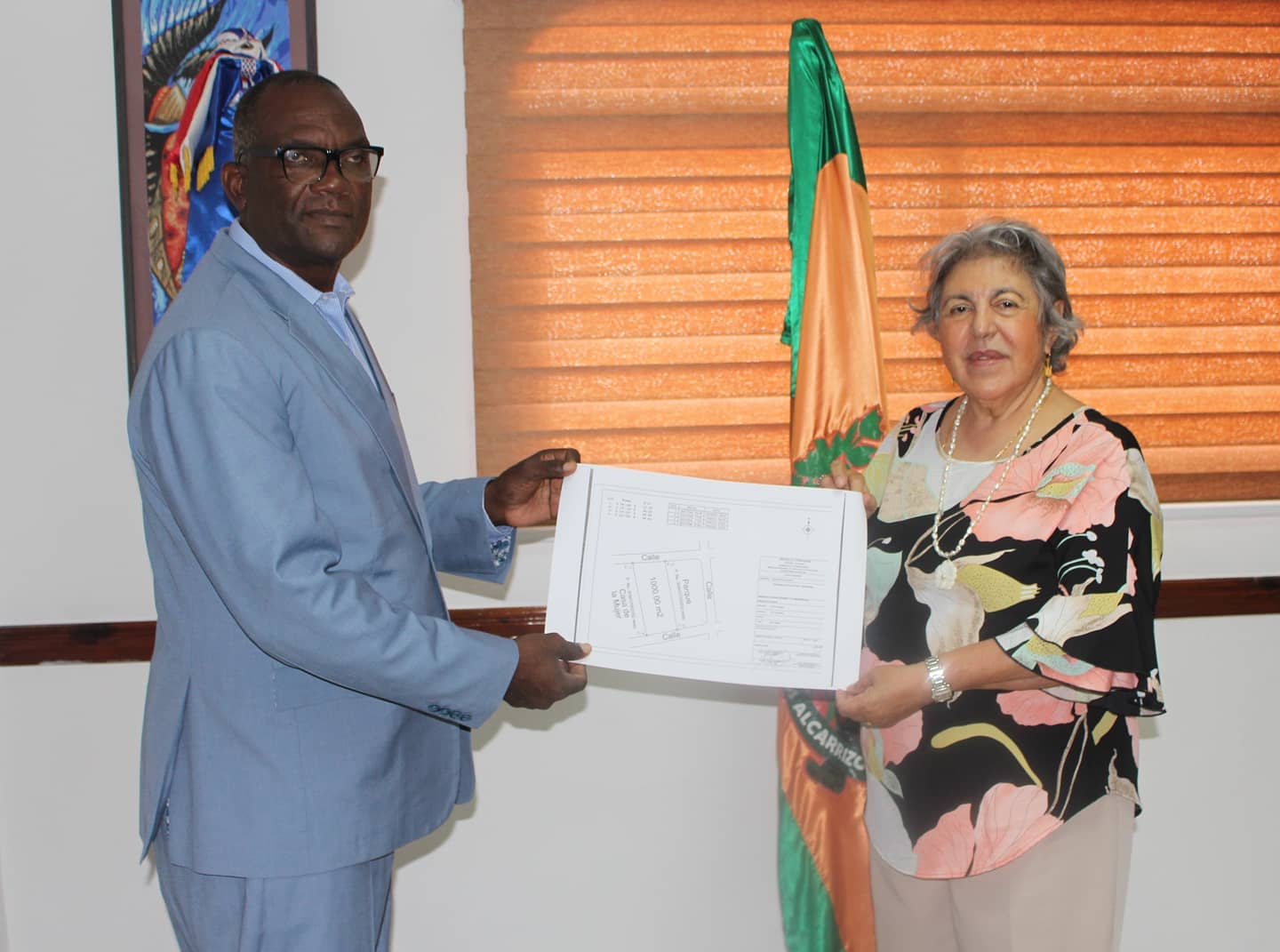 Los Alcarrizos, RD.- La directora ejecutiva de Profamilia, Magaly Caram recibió de manera formal, de manos del alcalde @cristianencarnacionrd los 1000m² del área verde del residencial Madrid, que les donó mediante resolución la institución para la construcción de una sucursal en Los Alcarrizos.