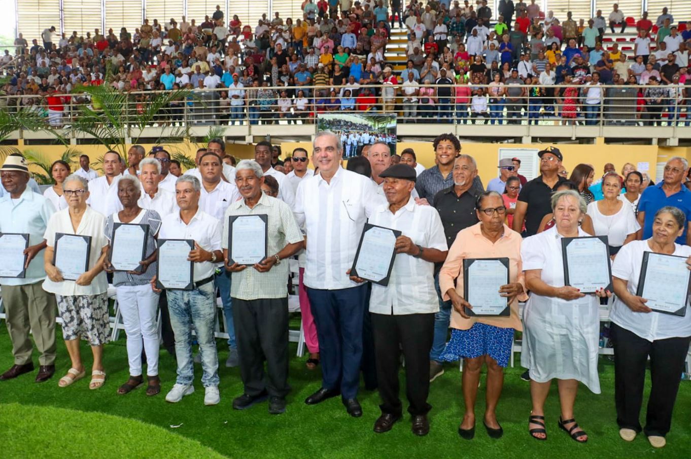 En un emotivo acto realizado en el multiuso de la entrada de Los Alcarrizos, el presidente Luis Abinader, junto al alcalde Junior Santos, encabezó la entrega de 1,300 títulos de propiedad a familias del sector Pueblo Nuevo, marcando un importante avance en materia de seguridad jurídica y bienestar social.